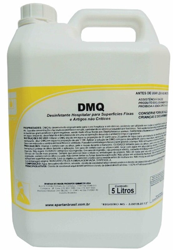 Propriedades: DMQ foi desenvolvido originalmente para o uso hospitalar e em clínicas, podendo ser utilizado em todas as superfícies laváveis tais como: mesas, balcões, pisos, paredes, portas, metais, louças sanitárias, macas, camas, cadeiras, mobiliários em geral do paciente, termômetros axilar, estetoscópios, suporte de soro, aparelhos de pressão, comadres, papagaios, bacias, cubas rim, cadeiras de banho, etc.