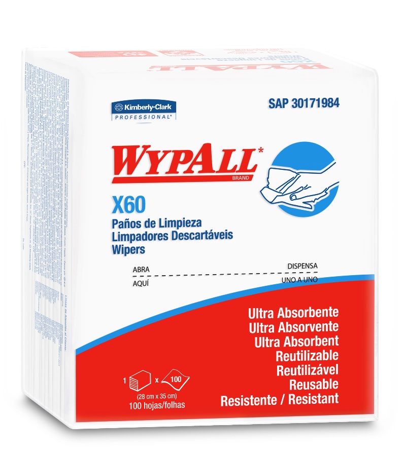 Os panos de limpeza WYPALL* X60, feitos de polipropileno (20%) e celulose (80%), são ideais para limpar todos os locais e superfícies. São produzidos com a tecnologia HYDROKNIT*, o que os tornam superiores a outros panos convencionais e trapos.